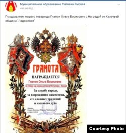 Как рассказал Север.Реалии руководитель аппарата Виктор Перов, грамоту прислал казак Александр Калинин, в администрации решили ее выложить.