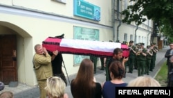 Закрытый гроб обит красной тканью и накрыт российским триколором. Он стоит в центре актового зала. Звучит траурный марш Шопена. В небольшом помещении с бледно-желтыми стенами под потолком висит зеркальный диско-шар: скорее всего, здесь же в другое время проходят дискотеки.