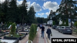 В церкви на кладбище идет отпевание. Часть пришедших людей стоит на улице, остальные - внутри. Журналистов в церковь не пускают.